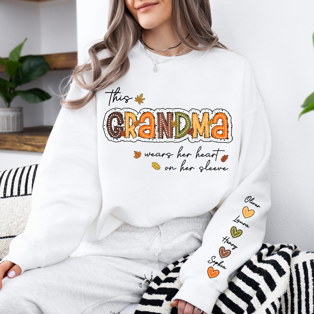 Personalized Gift For Grandma - Grandma Wears Her Heart On Her Sleeves - Custom Name Christmas Shirt