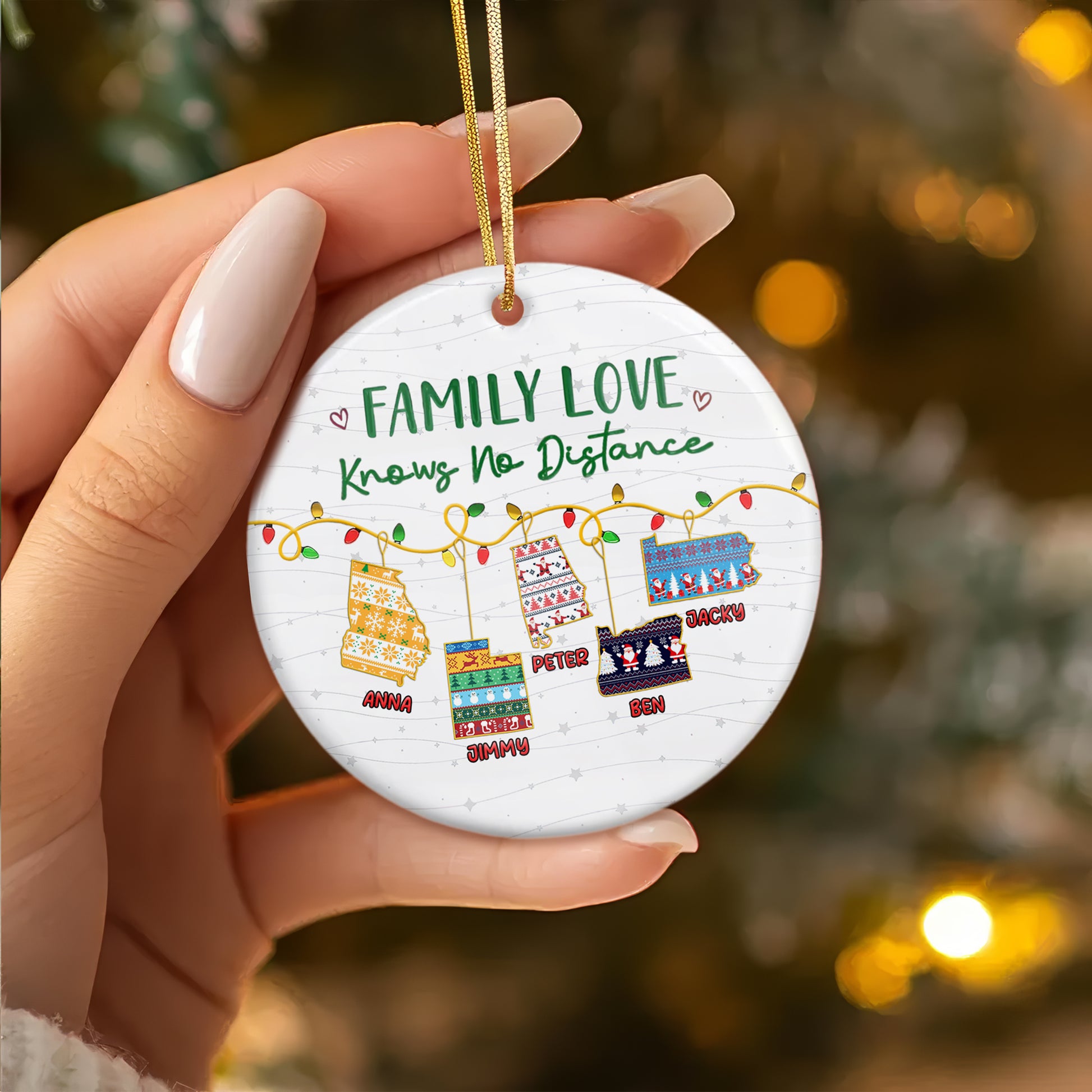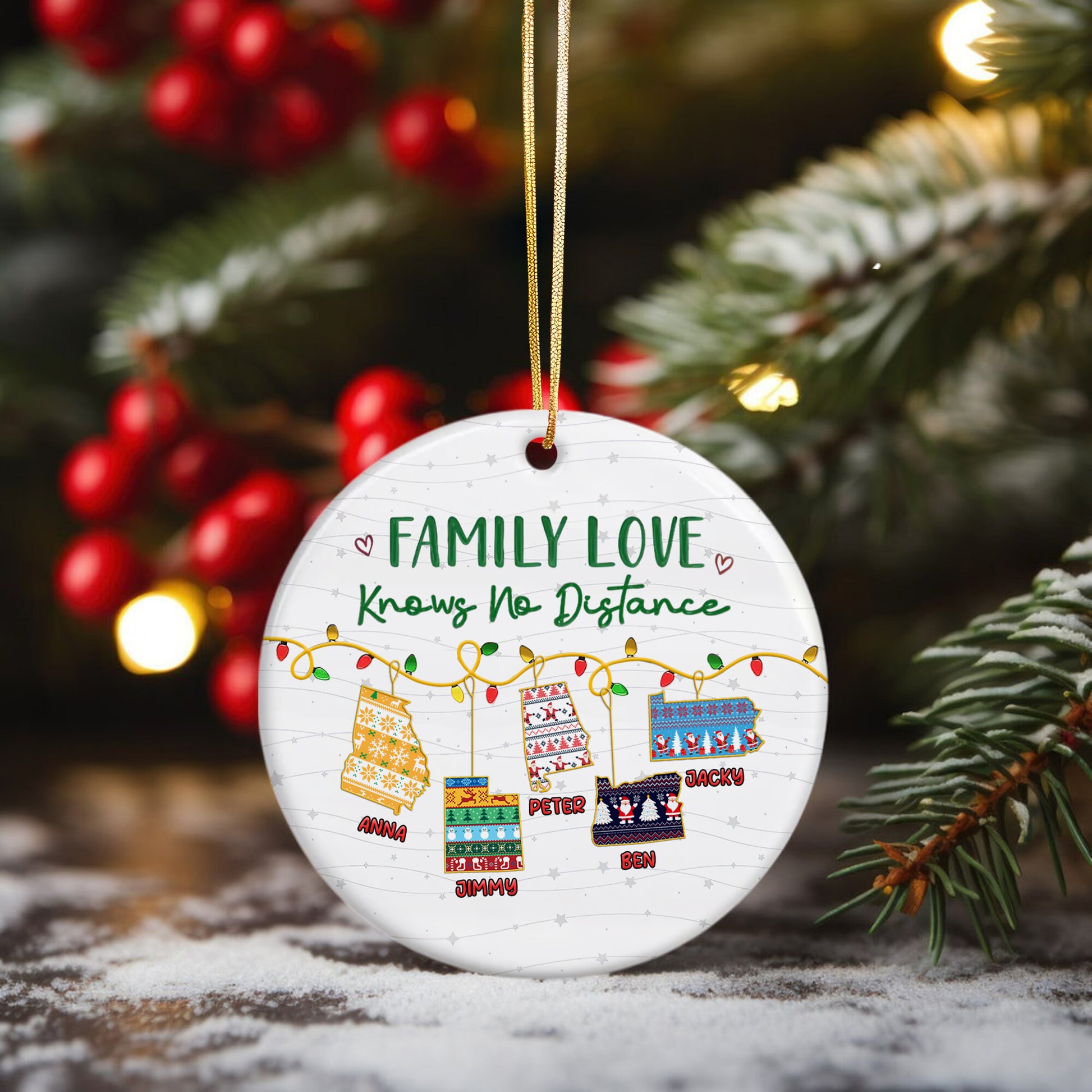 Custom Name and State Ceramic Ornament - Family Love Knows No Distance - Home Decor